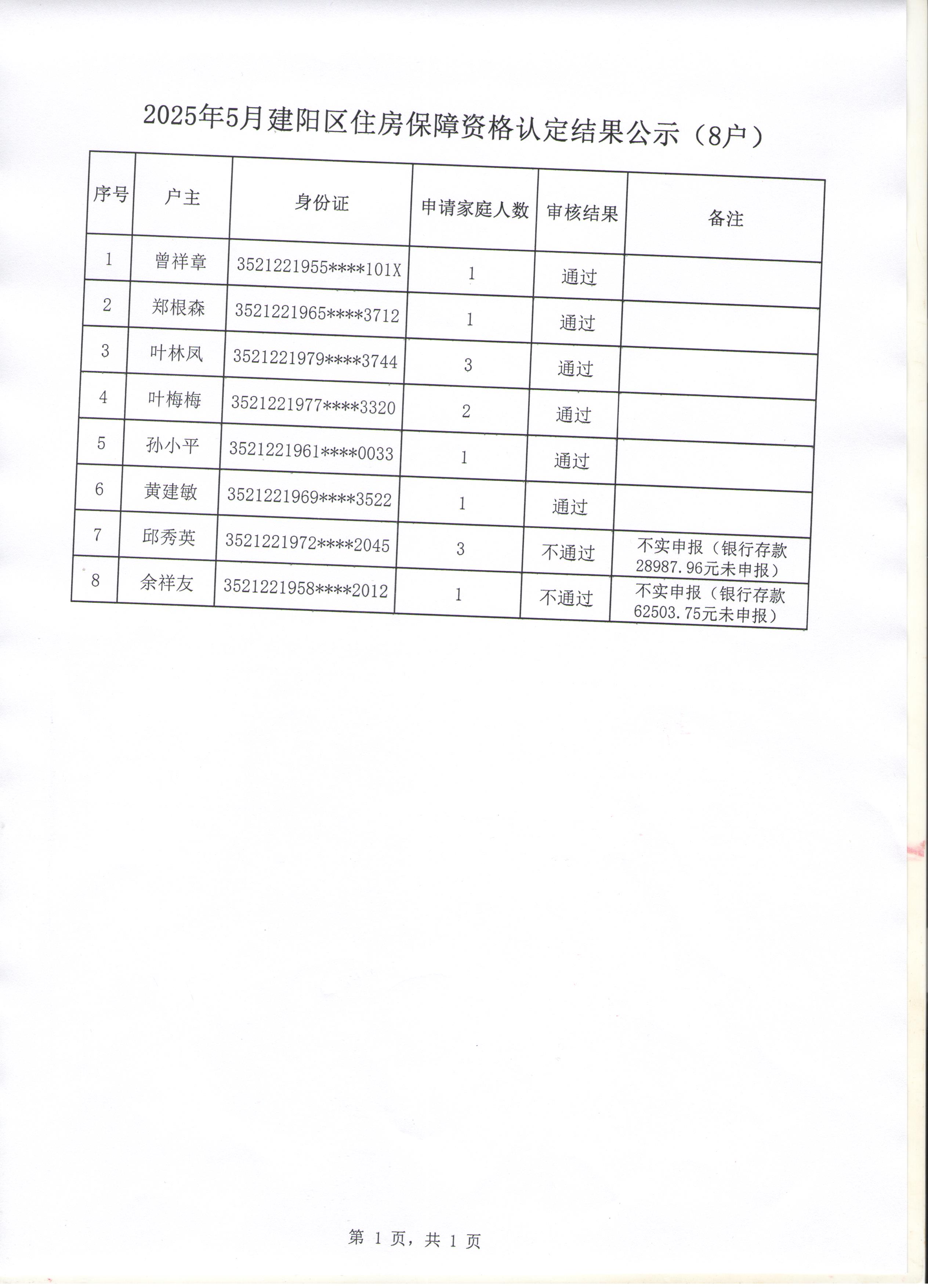 2025年5月建阳区住房保障家庭资格认定结果公示