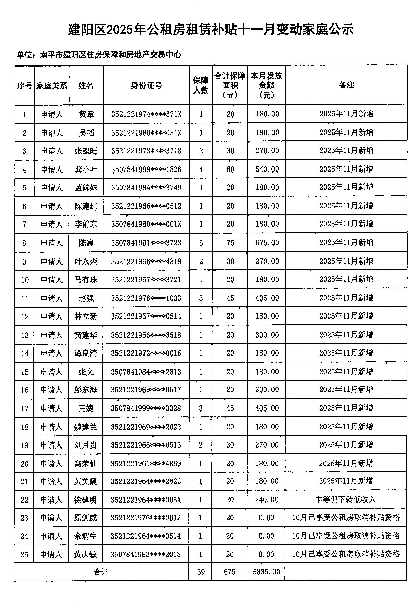 建阳区2025年公共租赁住房租赁补贴十一月发放明细