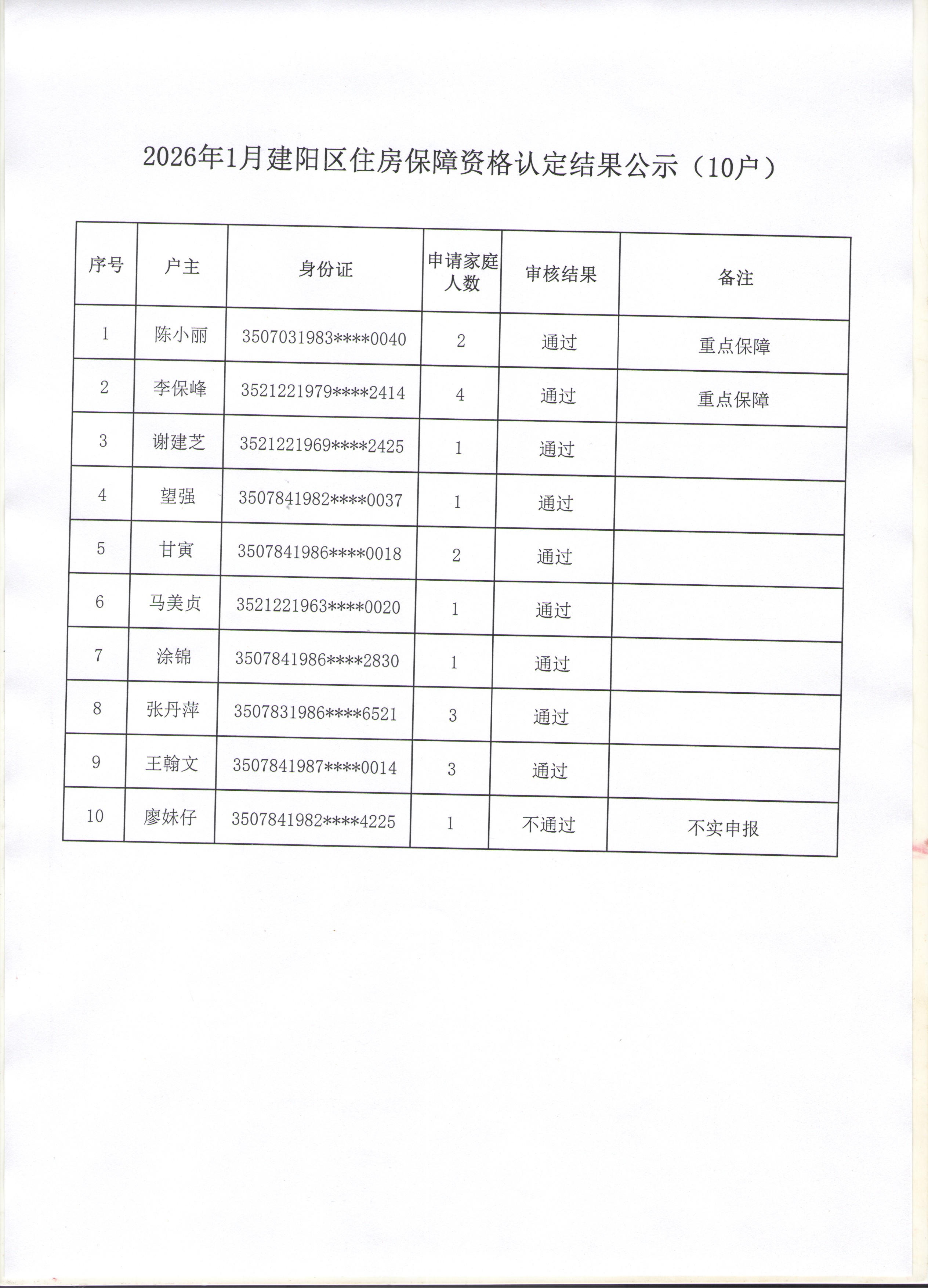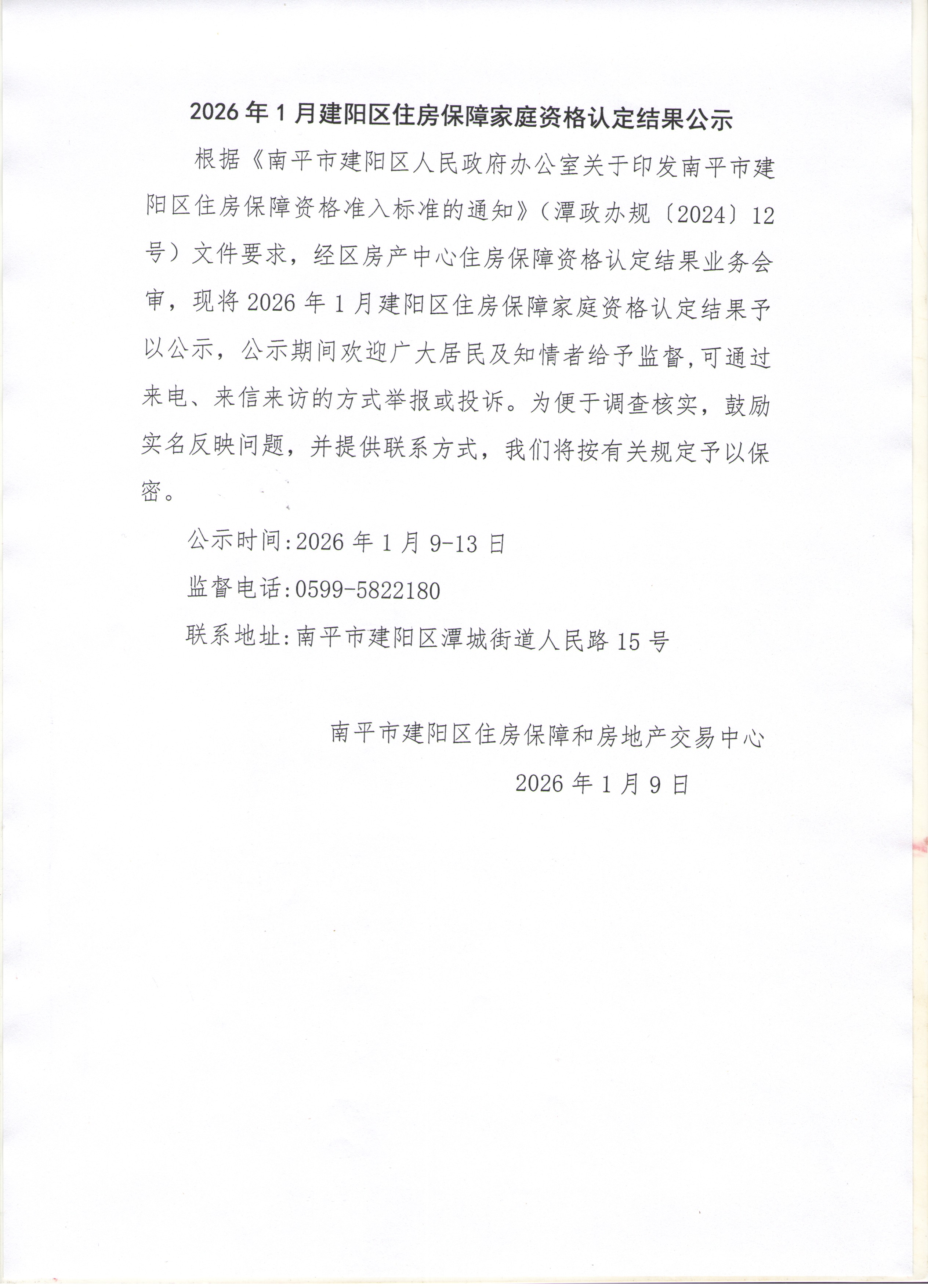 2026年1月建阳区住房保障家庭资格认定结果公示