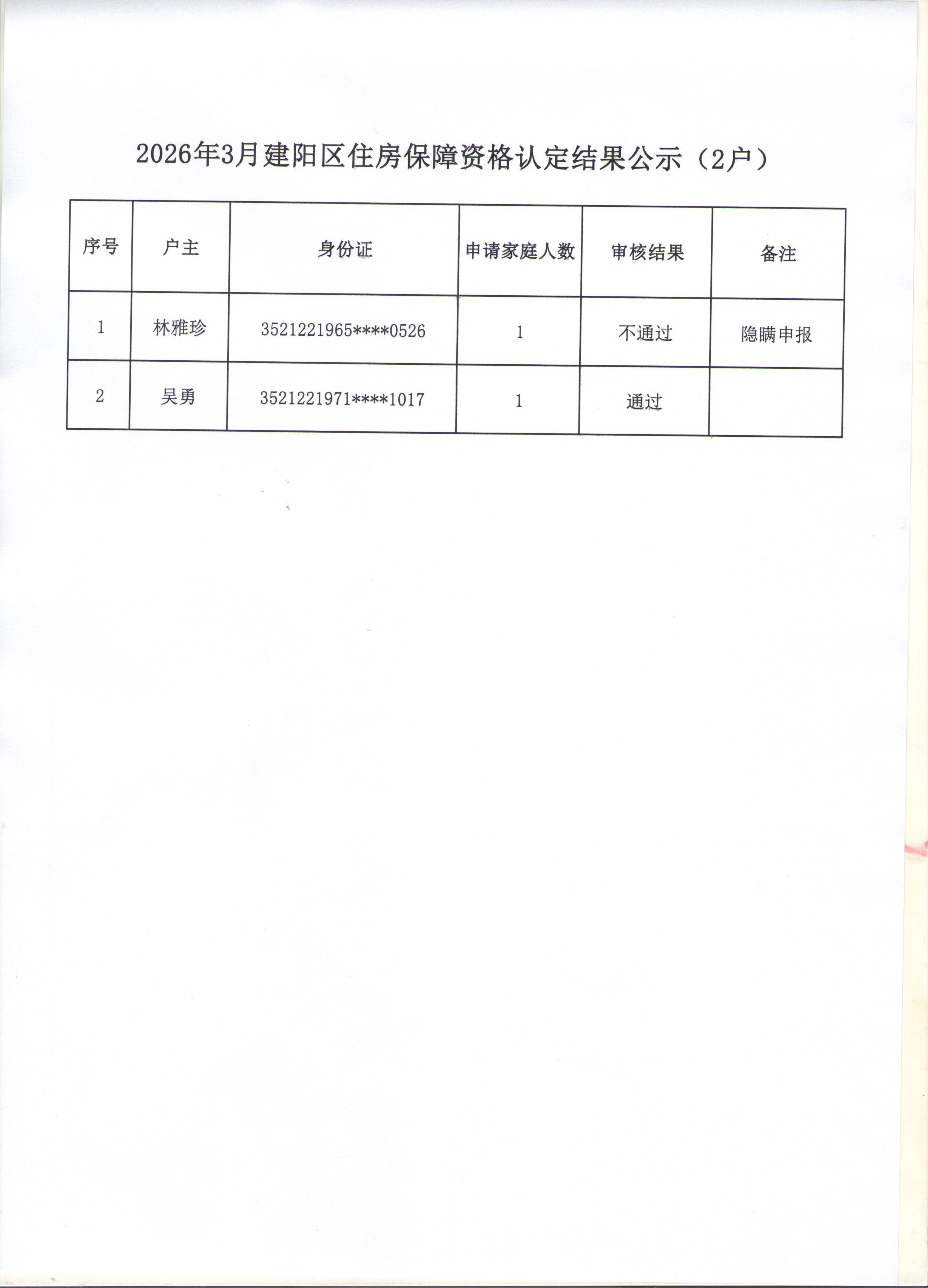 2026年3月建阳区住房保障家庭资格认定结果公示